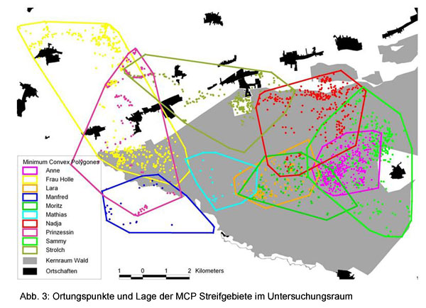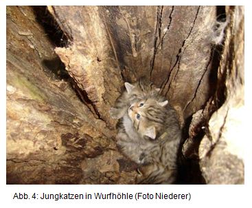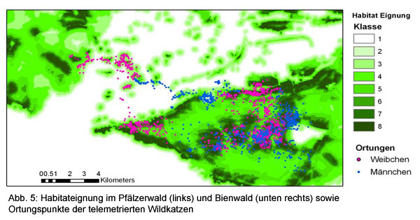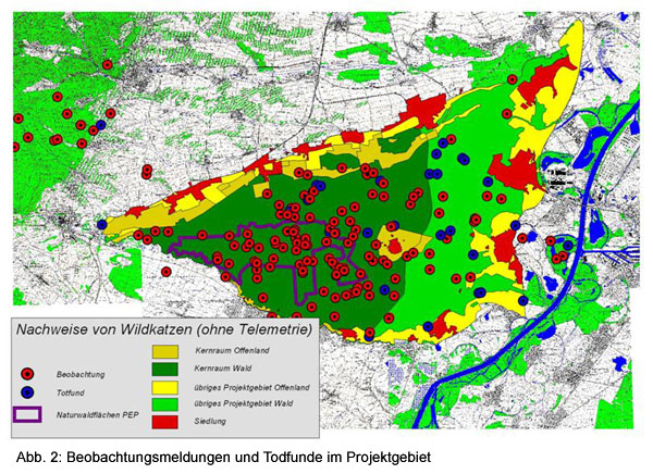 Die Wildkatze im Bienwald![]() In den Jahren2006/07 wurden im Bienwald durch ÖKO-LOG Freilandforschung Untersuchungen zum Vorkommen, zur Ökologie und zum Schutzbedarf der Wildkatze (Felis silvestris silvestris) durchgeführt.Die Arbeiten wurden im Rahmen der Erstellung des Pflege- und Entwicklungsplanes für das Naturschutzgroßprojekt Bienwald im Auftrag des Projektträgers Landkreise Germersheim und Südliche Weinstraße durchgeführt und durch das Bundesamt für Naturschutrz mit Mitteln des Bundesministeriums für Umwelt, Naturschutz und Reaktorsicherheit und dem Ministerium für Umwelt, Forsten und Verbraucherschutz - Rheinland-Pfalz gefördert. Ergänzende Untersuchungen fanden im Rahmen des Projektes "Grenzüberschreitende Begegnungen mit der Wildkatze" statt. Ziel war es Antworten im Rahmen folgender übergeordneter Themen zu liefern: Angewandte Methoden waren die Suche nach Spuren im Schnee, die Erfassung von Totfunden und Beobachtungen; der Fang und die anschließende telemetrische Beobachtung von 10 Wildkatzen sowie die Kartierung wichtiger Lebensraumparameter.Die Wildkatze galt im Bienwald, wie in fast allen anderen Wäldern Deutschlands, in der Zeit nach den beiden Weltkriegen als ausgestorben. Die ersten dokumentierten Wildkatzennach-weise im Bienwald aus jüngerer Zeit datieren aus dem Jahr 1977. Seit den 80er Jahren erfolgten regelmäßig Beobachtungen. Die Vorkommen konzentrieren sich auf den zentralen Bienwald. In der geplanten Naturwaldfläche ist die Beobachtungsdichte am höchsten. Der Fangerfolg im zentralen Bienwald war mit 7 Fängen in 140 Fallennächten hoch. Drei Wildkatzen wurden im Offenland zwischen Pfälzerwald und Bienwald gefangen. Die Streifgebiete der im Wald beobachteten Wildkatzen lagen mit 500 bis 1500 ha bei den weiblichen Katzen und bis über 2000 ha bei den männlichen Katzen in einer Größenordnung, wie sie aus anderen Untersuchungen bekannt ist. Die drei Weibchen, die teilweise bzw. überwiegend Offenland nutzten, hatten mit 1500 ha bis 3000 ha deutlich größere Streif-gebiete. Streifgebiete von Katzen und Kudern überlagerten sich vollständig. Zwischen gleichgeschlechtlichen Tieren zeigten sich jeweils nur partielle Überschneidungen.Entwicklung von Kernlebensräumen für die Wildkatze Korridore zwischen Pfälzerwald und Bienwald Es wurden auch 4 Tiere beobachtet, die im Offenland zwischen Bienwald und Pfälzerwald ihr Streifgebiet hatten. Das Verhalten dieser Tiere legt die Vermutung nahe, dass es sich hierbei um abgedrängte, nicht erwachsene Wildkatzen handelt, die im Reproduktionsgeschehen der Art noch keine Rolle spielen. Aufgrund der Beobachtungen der Tiere im Offenland konnte der Beweis erbracht werden, dass ein genetischer Austausch zwischen den Populationen zwischen Bienwald und Pfälzerwald derzeit noch möglich ist. Es konnten zwei Korridore durch die Otterbachniederung ermittelt werden, die von den Tieren tatsächlich genutzt wer-den. Im Korridor der Otterbachniederung bildeten kleine Gehölze und Staudenfluren die wichtigsten Trittsteinbiotope. Insbesondere Gehölze ab 1 ha Größe erwiesen sich als wichtig. Die Abstände zwischen den als Trittsteine fungierenden Gehölzen von 0,5 bis über 2,5 ha Größe lagen im Korridor zwischen 500 m und 1000 m (max. 1300 m). Die Tiere näherten sich im Offenland nicht näher als 220 m bis 450 m der Bebauung. Daraus leiten wir ab, dass Bebauungslücken, durch die ein Korridor für Wildkatzen führen soll, mindestens eine Breite von 1000 m haben müssen. Weitere Korridore verlaufen zwischen Neuburg und Maximilian-sau zum Rhein. Um die nördlichen Rheinauen über die Achse Jockrim-.Neupotz-Leimersheim anzubinden wären Maßnahmen erforderlich, die den Wildkatzen erlauben diese Achse ungefährdet entlang zu wandern.Ein von KLAR et al. (2010) entwickeltes Habitatmodell wurde auf den Bienwald angewendet. Mit diesem Modell ließen sich mit hoher Vorhersagekraft die von Wildkatzen besiedelten bzw. bevorzugten Räume vorhersagen. Die Wildkatzen des Offenlandes wichen von diesem Muster ab. Wir meinen dass es typisch für nicht adulte, abgedrängte Wildkatzen ist, dass sie in schlechteren Habitaten leben als dominante Alttiere. Das Modell erwies sich als die am besten geeignete Methodik zur Vorhersage geeigneter Lebensräume. Das gesamte Gutachten gibt es hier demnächst als pdf zum download